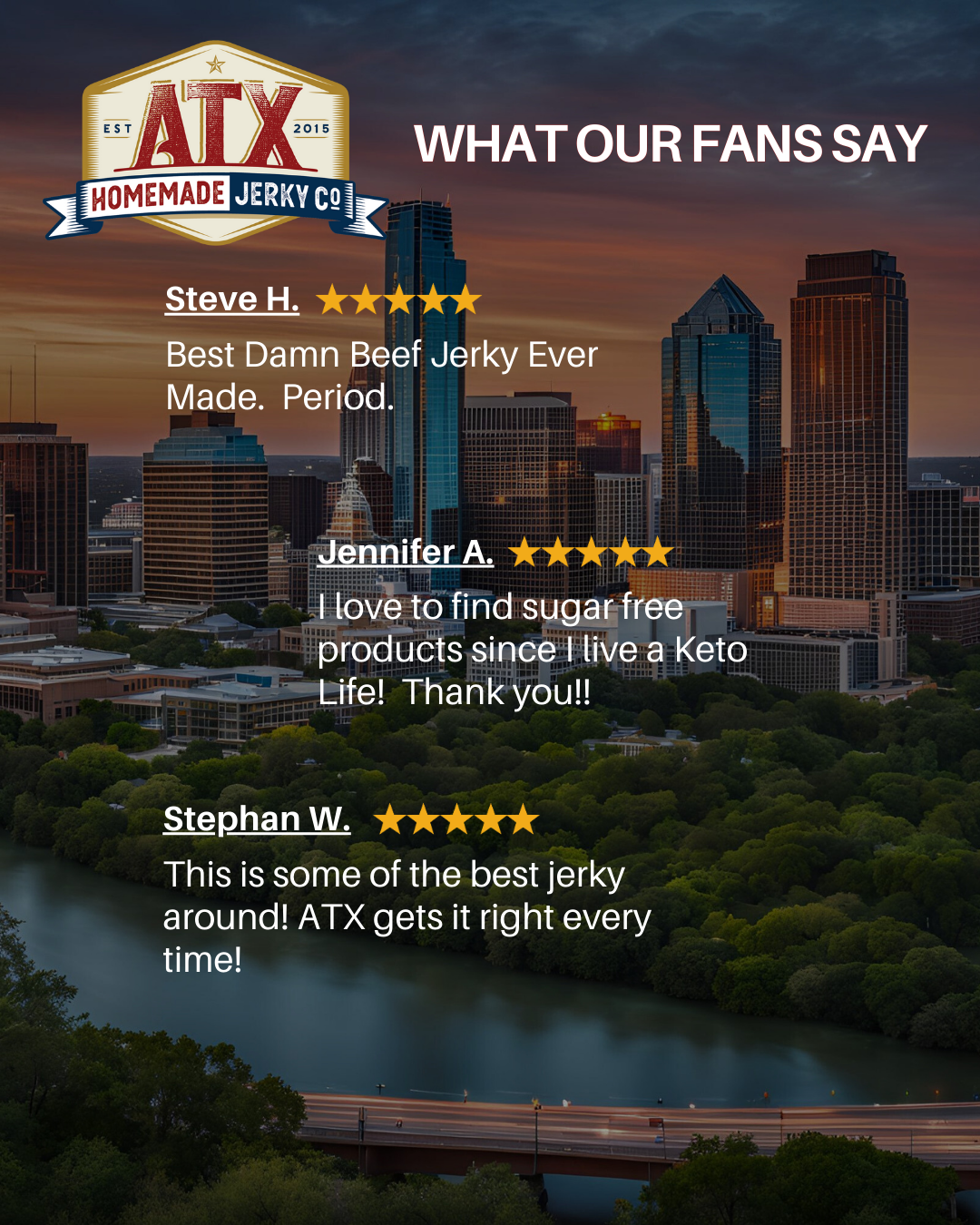 "ATX Jerky is our favorite because the texture is never tough! The Garlic Lovers jerky is delicious - it has a great balance of garlic and salt flavors. Think garlic bread, but low carb!" "ATX Jerky is our favorite because the texture is never tough! The Garlic Lovers jerky is delicious - it has... "ATX Jerky is our favorite because the texture is never tough! The Garlic Lovers jerky is delicious - it has a great balance of garlic and salt flavors. Think garlic bread, but low carb!"